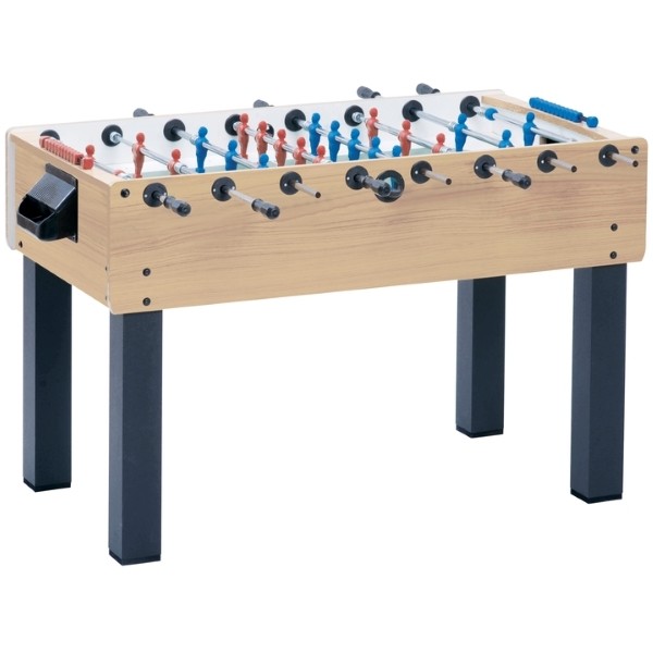 calciobalilla adatto per uso interno, aste rientranti telescopiche, scorrimento aste su cuscinetti a sfera, manopole in plastica, mobile in mdf 20mm con rivestimento melaminico colore rovere, gambe 90x90mm in mdf con rivestimento melaminico colore nero, campo di gioco in vetro temperato spessore 5mm con sfondo verde prato e linee bianche che riproducono il terreno dello stadio, dimensioni cm.145 x 110 x h.88