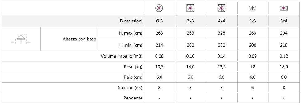 (misura 4×4 stecche diagonali rinforzate 15x35mm), apertura a doppia carrucola con corda, copertura con pendente e soffietto antivento in tessuto acrilico 100%, 320 gr. colore ecrù o bianco oppure tempotest® parà ombrelloni 300gr disponibile in vari colori, base non inclusa fornita come accessorio