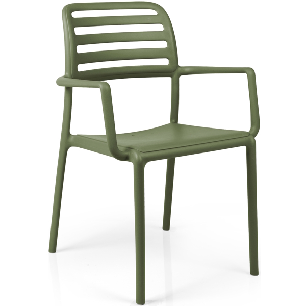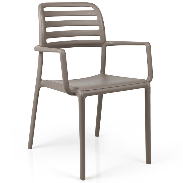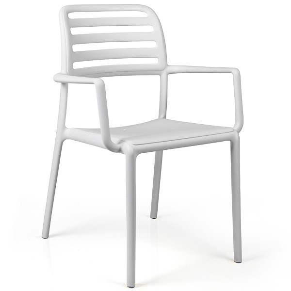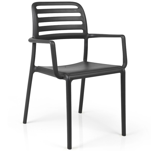 poltroncina impilabile, adatta per uso esterno, struttura in polipropilene fiberglass trattato anti-UV e colorato in massa, finitura opaca, con piedini antiscivolo,